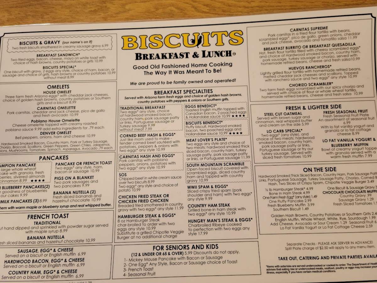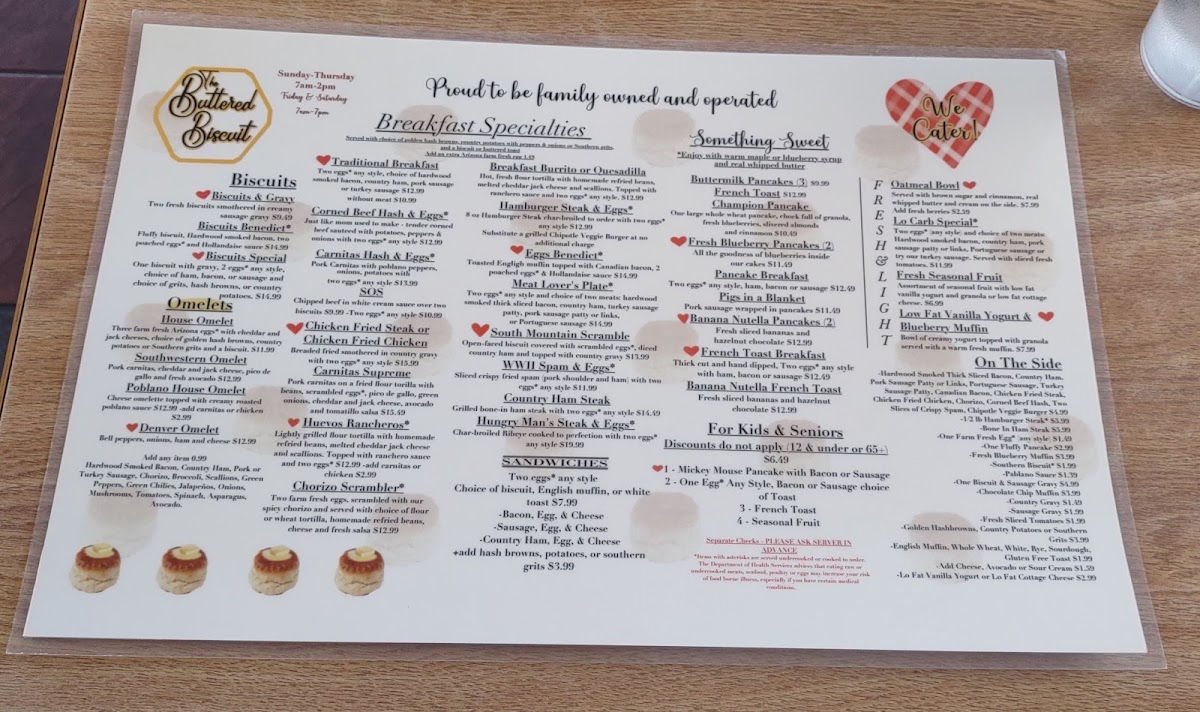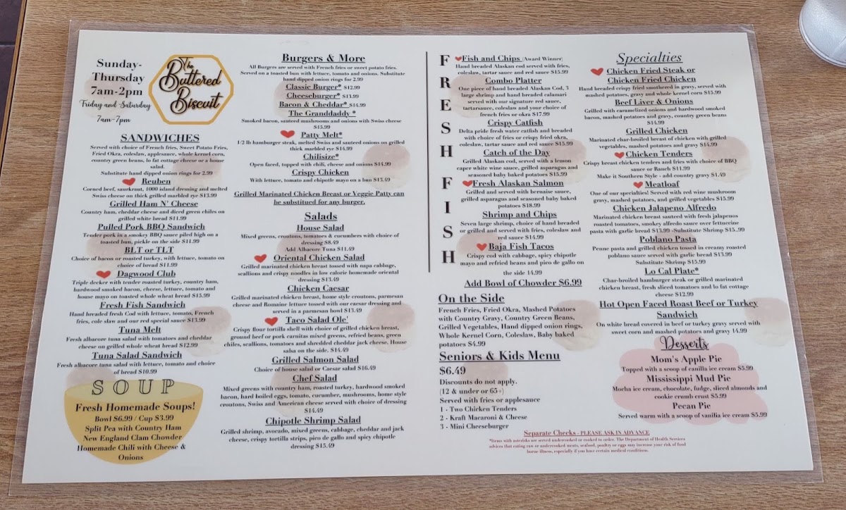 From a reviewer’s perspective, the menu at The Better Biscuit feels like a well-rounded celebration of classic American comfort food, thoughtfully expanded to suit breakfast, lunch, and even Friday night dining. To conclude, what stands out most is the sheer breadth of choices, starting with familiar morning beverages like Coffee, Coffee (Decaf), Hot Chocolate, Hot Tea, and Large Juice, which pair naturally with hearty breakfast specialties such as Biscuits And Gravy, Bacon Egg And Cheese Sandwich, TBB Special Hash & Eggs, and Carnitas Supreme. The breakfast lineup continues to impress with bold burrito options including Albuquerque Burrito, Carnivore Burrito, Sweet Sausage Cake-Rito Breakfast Burrito, and Spam Burrito, alongside indulgent Benedicts like Prime Time Benny, Spam Benedict, Biscuit Benedict, Traditional Benedict, and Country Scramble Benedict. For those craving something sweet, selections such as Banana Nutella Pancakes (2), Banana Nutella French Toast, Blueberry Pancakes (2), Buttermilk Pancakes (3), and the Gold Medal Pancake round out the morning perfectly, while omelets like Denver Omelet, Cheese Omelet, Poblano Omelet, Veggie Omelet, and Fun Guy Omelet add savory balance. Lighter fare, including Fresh Seasonal Fruit, Keto Special, Low Fat Vanilla Yogurt & Blueberry Muffin, and Oatmeal Bowl, ensures there’s something for every appetite. As the day moves into lunch, the menu confidently shifts to classics such as Beef Liver & Onions, Chicken Fried Chicken Lunch, Chicken Fried Steak Lunch, Chicken Tenders, and Grilled Chicken Lunch, complemented by satisfying burgers like Bacon & Cheddar Burger, Cheeseburger, Chilisize Burger, Classic Burger, and Chicken Sandwich. Salads (Chicken Caesar Salad, Southwest Shrimp Salad, Teriyaki Chicken Salad, Salmon Caesar Salad) and sandwiches (BLT, Dagwood Club, Fish Sandwich, Prime French Dip) add variety, while soups like Bowl Chili, Bowl Clam Chowder, Hangover Bowl, Cup Chili, and Cup Clam Chowder provide comforting depth. Fresh seafood options such as Baja Fish Tacos, Deep South Catfish, Fish & Chips, and Alaskan Cod reinforce the menu’s versatility, and desserts like Mom’s Apple Pie and Pecan Pie offer a nostalgic finish. Overall, this menu neatly ties together abundance, familiarity, and flexibility, leaving a lasting impression of a neighborhood restaurant that truly caters to all generations and tastes.